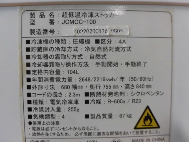 中古厨房 JCM 業務用 超低温 フリーザー JCMCC-100 100V 104L -60℃〜-40℃ W680×D755×H840mm 上開き キャスター付 中フタ有り 2020年製