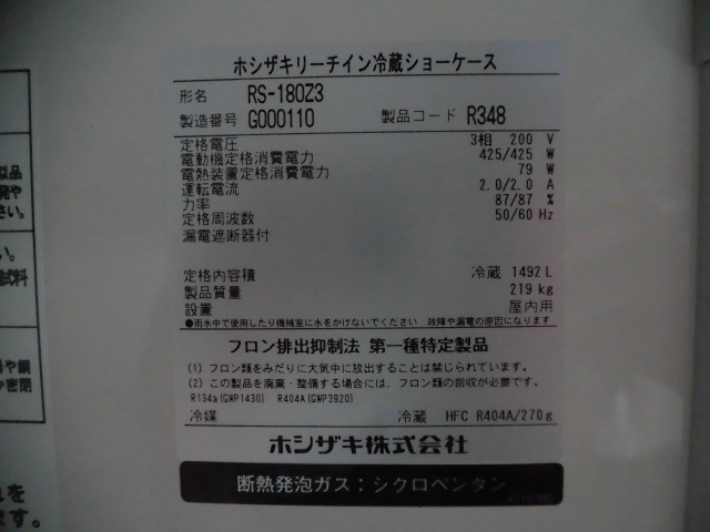 中古厨房 業務用 ホシザキ 縦型 リーチイン 冷蔵ショーケース RS-180Z3 冷蔵庫 1492L 三相 200V ロングスイング扉 2017年製