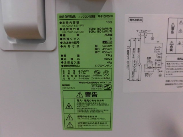 中古厨房 アイリスオーヤマ 小型 冷凍ストッカー 冷凍庫 フリーザー PF-B100TD-W 100V 100L 6段階調節 庫内灯 2023年製