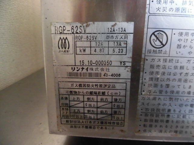 中古厨房 リンナイ 業務用 上火式 グリラー RGP-62SV ペットミニ 焼物器 都市ガス 圧電点火 立消え安全装置 焼き網付 W630×D290×H400mm