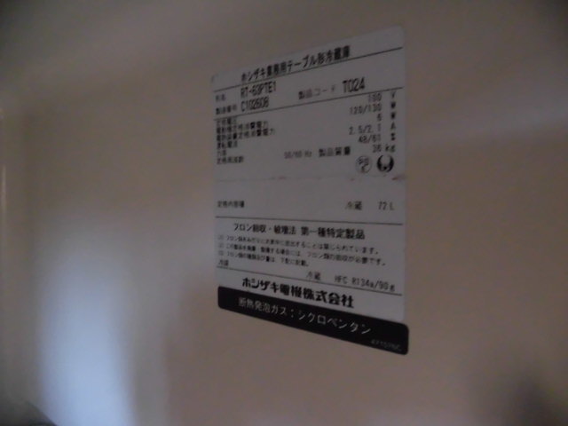 中古厨房 ホシザキ 業務用 台下 1ドア 冷蔵庫 RT-63PTE-1 100V 72L コールドテーブル ドアポケット付 内装樹脂仕様 W630×D450×H800mm