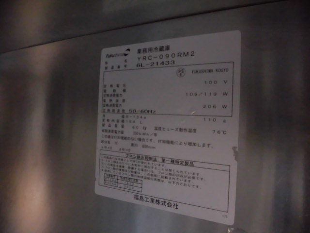 中古厨房 業務用 フクシマガリレイ 福島工業 1ドア 台下 冷蔵庫 YRC-090RM2 100V 154L 薄型タイプ 庫内灯付き W900×D600×H800m