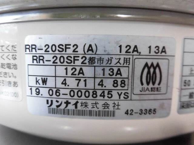 中古厨房 業務用 リンナイ ガス炊飯器 RR-20SF2(A) 3.6L 2升 都市ガス 連続スパーク点火 立ち消え安全装置 ガスホース付き 2019年製