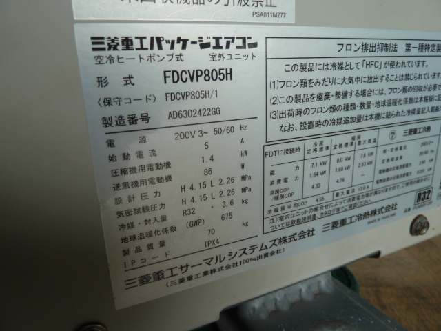 ・能力:3馬力 冷房7.1kW/暖房8.0kW(室外機)