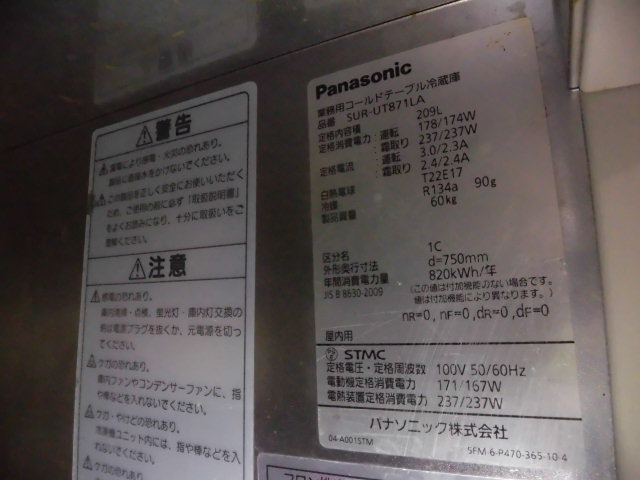 中古厨房 業務用 パナソニック コールドテーブル 台下 1ドア 冷蔵庫 SUR-UT871LA 209L 100V 庫内灯 左開き W800×D750×H800mm 2017年製