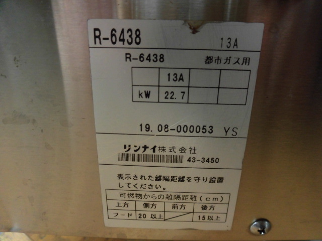 中古厨房 リンナイ 業務用 上火式 ガス赤外線 グリラー R-6438 都市ガス 大型 昇降レバー 立消え安全装置 W1240×D540×H644mm 2019年製