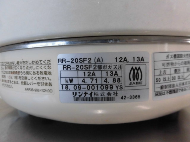 中古厨房 リンナイ Rinnai 業務用 ガス炊飯器 RR-20SF2 3.6L 2升 都市ガス 連続スパーク点火 立消え安全装置 W440 D320 H350 取説 2018年