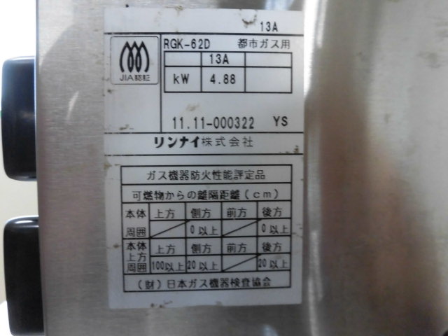 中古厨房 リンナイ 業務用 串焼き機 串焼62号 下火式 グリラー 焼き台 RGK-62D 都市ガス シュバンクバーナ 立消え安全装置 圧電式 焼き鳥