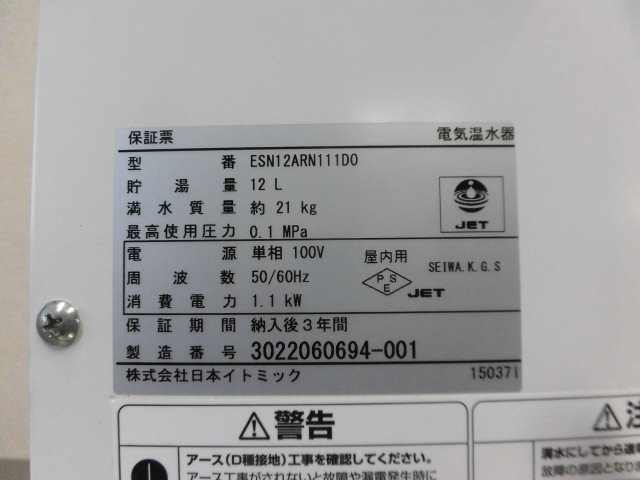 中古厨房 イトミック 業務用 小型 角型 床置型 電気温水器 給湯器 ESN12ARN111D0 単相 100V 貯湯量12L 給湯室・洗面所・厨房 2022年製