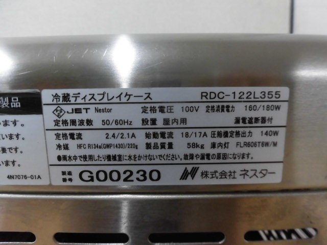 中古厨房 業務用 ネスター 冷蔵ショーケース ディスプレイショーケース RDC-122L355 100V 86L ガラス両面引戸 左ユニット 庫内灯 2017年製
