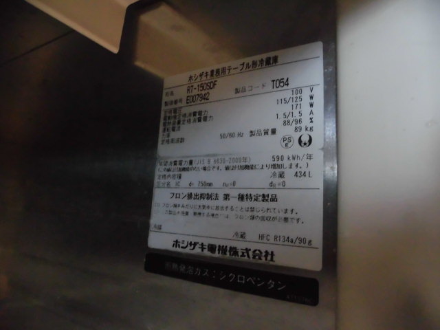 中古厨房 ホシザキ 業務用 台下 冷蔵庫 コールドテーブル RT-150SDF 100V 50/60Hz 434L 庫内灯付き W1500×D750×H800mm 店舗 飲食店