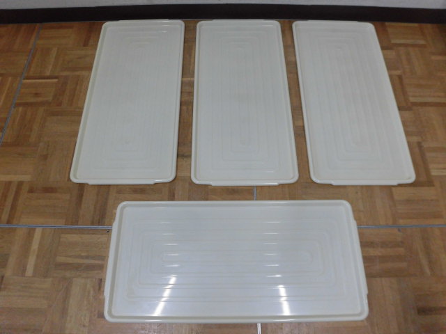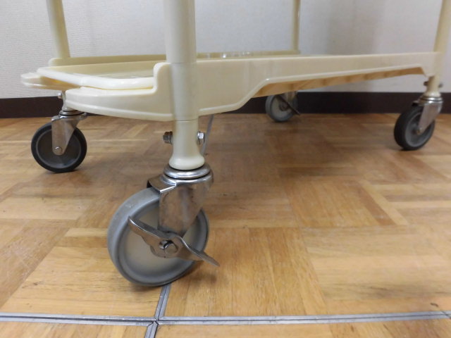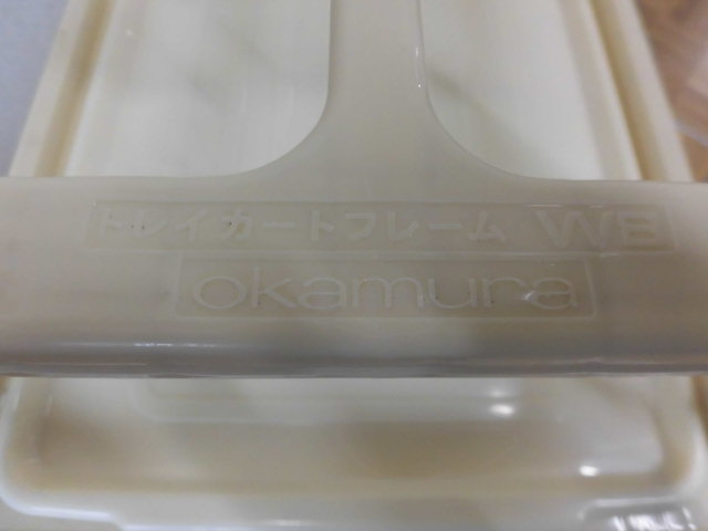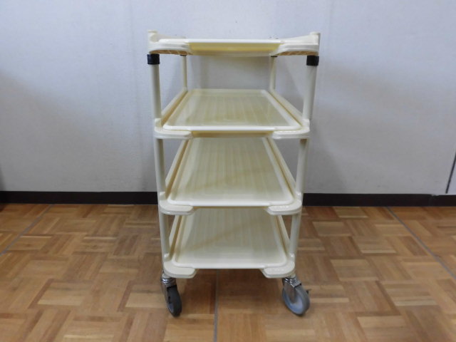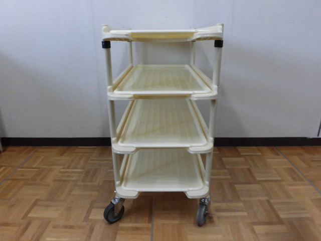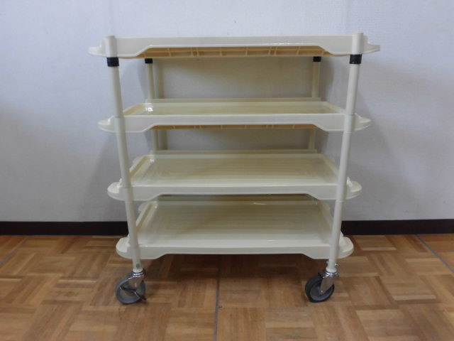 中古厨房 業務用 okamura トレイカート プラスチック 4段 ワゴン 配膳 カート サービスワゴン トレー4枚 キャスター W450×D810×H880mm