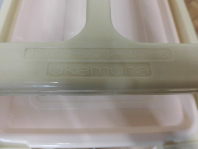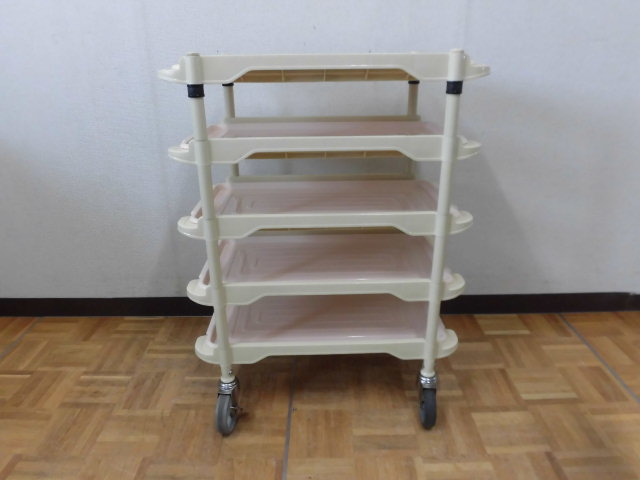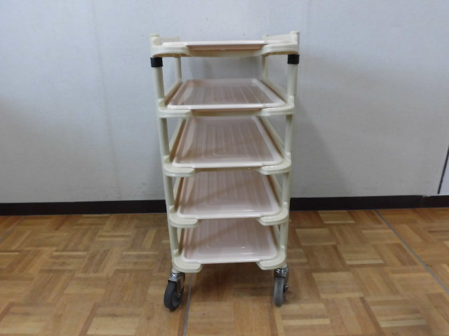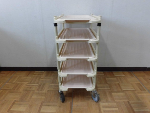 中古厨房 業務用 okamura トレイカート プラスチック 5段 ワゴン 配膳 カート サービスワゴン トレー5枚 キャスター W380×D650×H850mm