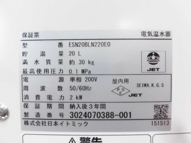 中古厨房 イトミック 業務用 角型 床置型 電気温水器 ESN20BLN220E0 単相 200V 貯湯量20L 30〜75℃ 通常出湯タイプ 2023年製