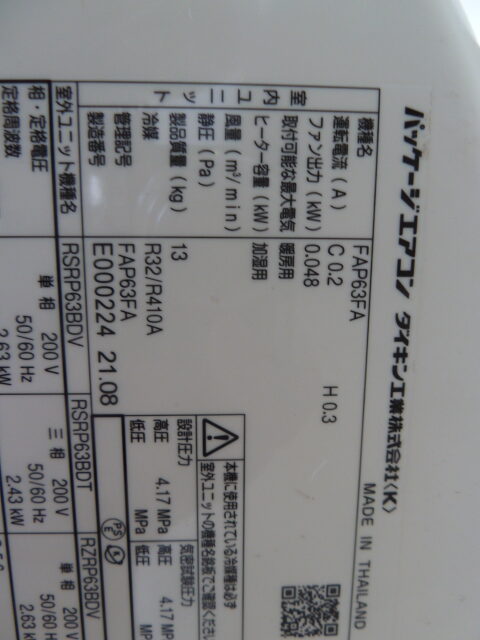 ・能力:2.5馬力 冷房5.6kW/暖房6.3kW