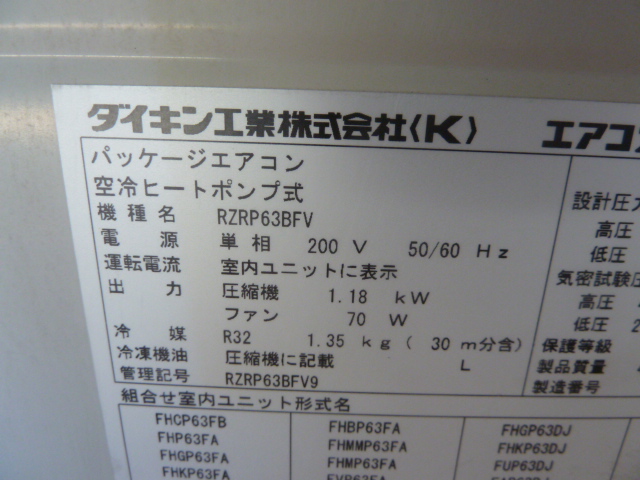 ダイキン 業務用 パッケージ エアコン 壁掛形 EcoZEAS SZRA63BJNV 2.5馬力 シングル 標準型 単相 200V ワイヤードリモコン 2022年製