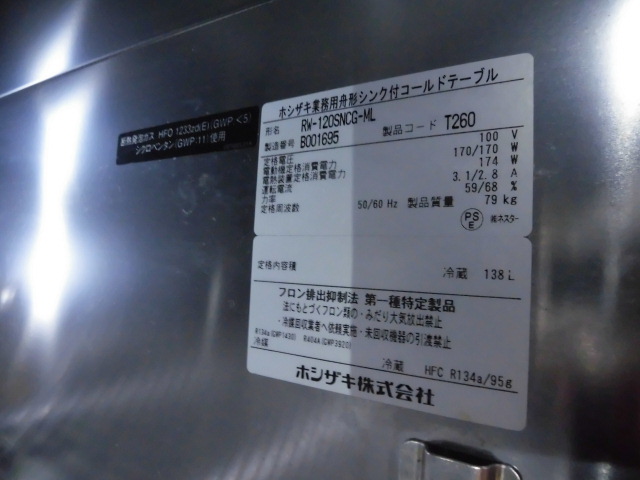 中古厨房 ホシザキ 業務用 舟形シンク付 台下 冷蔵庫 RW-120SNCG-ML 100V 138L コールドテーブル 庫内灯 W1200×D600×H800mm 2022年製