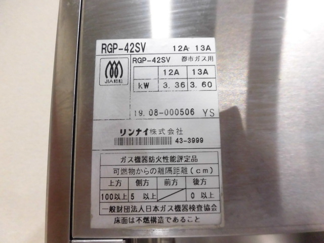 中古厨房 リンナイ 業務用 上火式 ガス赤外線 グリラー RGP-42SV 都市ガス ペットミニ 圧電式自動点火 立消え安全装置 2018年製