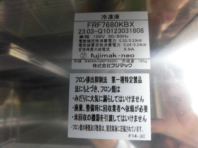 中古厨房 フジマック 業務用 縦型 2面 冷凍庫 フリーザー FRF7680KBX 単相 100V 右開き W760×D810×H1890mm 棚板4枚 2023年製