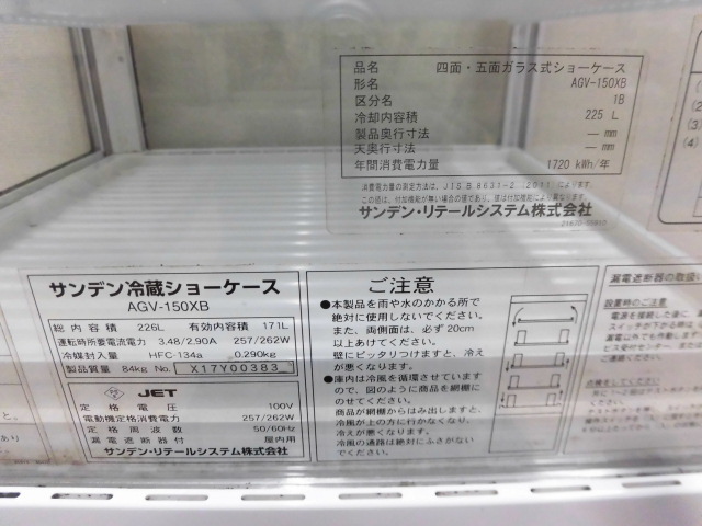 中古厨房 サンデン 業務用 縦型 4面ガラス 冷蔵ショーケース AGV-150XB 100V 171L 左開き キャスター 温度計 W500×D534×H1608mm 2017年