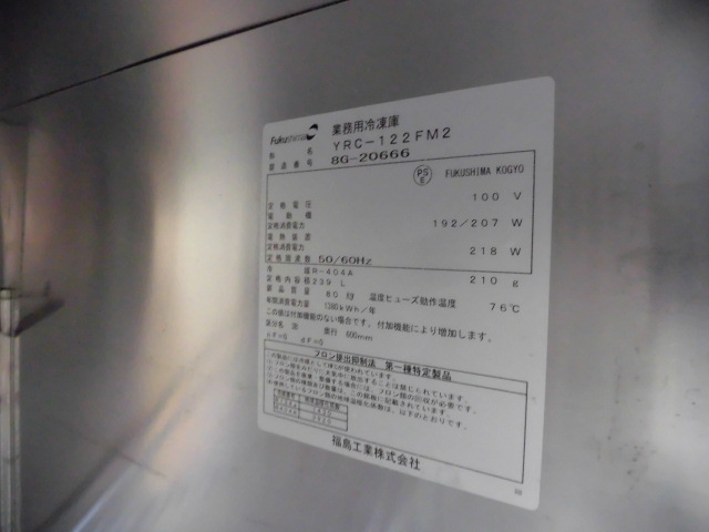 中古厨房 フクシマガリレイ 業務用 台下 冷凍庫 フリーザー コールドテーブル YRC-122FM2 100V 239L W1200×D600×H800mm 2018年製