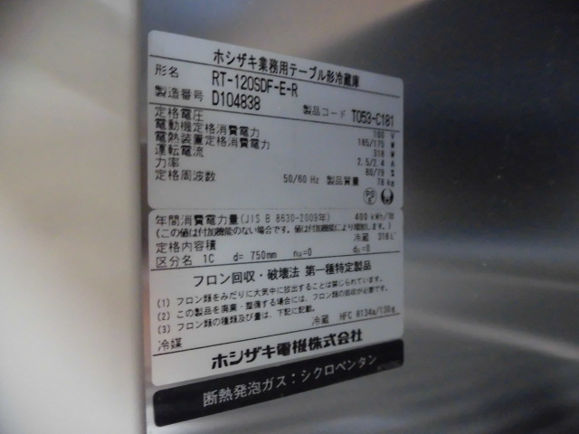 中古厨房 ホシザキ 業務用 台下 冷蔵庫 コールドテーブル RT-120SDF-E-R 100V 318L 庫内灯 インバーター 右ユニット W1200×D770×H800mm