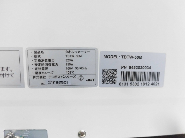 中古厨房 業務用 テンポス タオルウォーマー おしぼりスチーマー TBTW-50M 100V 12L 50〜55本用 前開き W420×D275×H290mm 2019年製