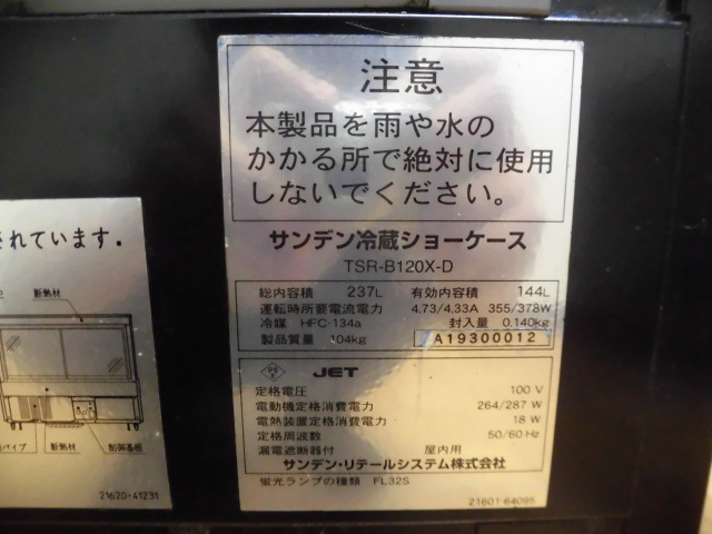 中古厨房 サンデン 業務用 対面 冷蔵ショーケース ディスプレイショーケース TSR-B120X-D 100V 144L 後引き戸 キャスター 庫内灯 2019年製