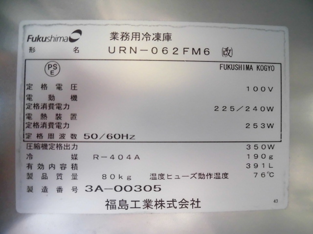 中古厨房 業務用 フクシガリレイ 縦型 2面 冷凍庫 URN-062FM6(改) 100V 391L 右開き W610×D650×H1950mm 店舗 飲食店