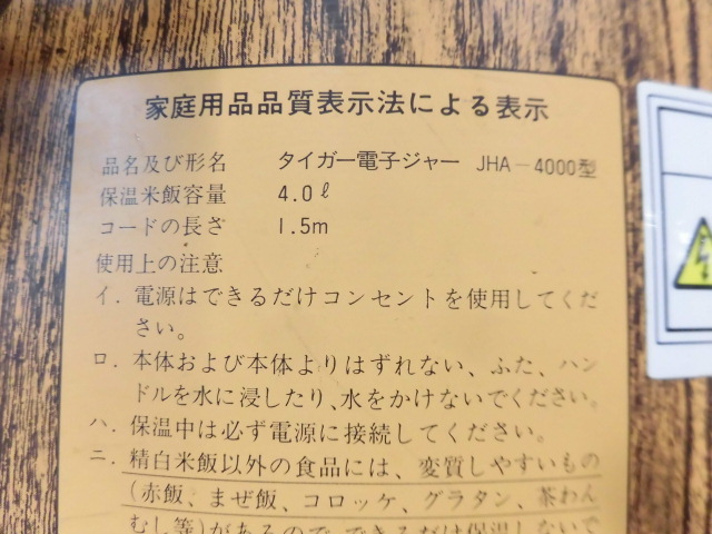 中古厨房 タイガー 業務用 電子 保温ジャー JHA-4000 2升2合 4L 100V 魔法瓶 炊きたて 保温専用 ダブルヒーター 木目 W435×D358×H270mm