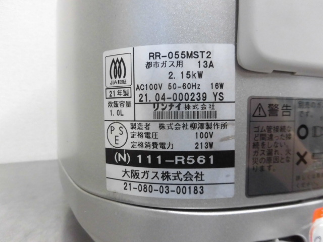中古厨房 リンナイ 家庭用 電子ジャー付 ガス 炊飯器 直火匠 RR-055MST2 都市ガス かまど炊き 5.5合炊き シルバー 蓄熱圧釜 2021年製