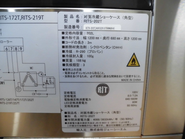 中古厨房 業務用 JCM RIT 対面 角型 冷蔵ショーケース RITS-202T 100V 202L ケーキケース ディスプレイケース 庫内灯 キャスター 2022年製