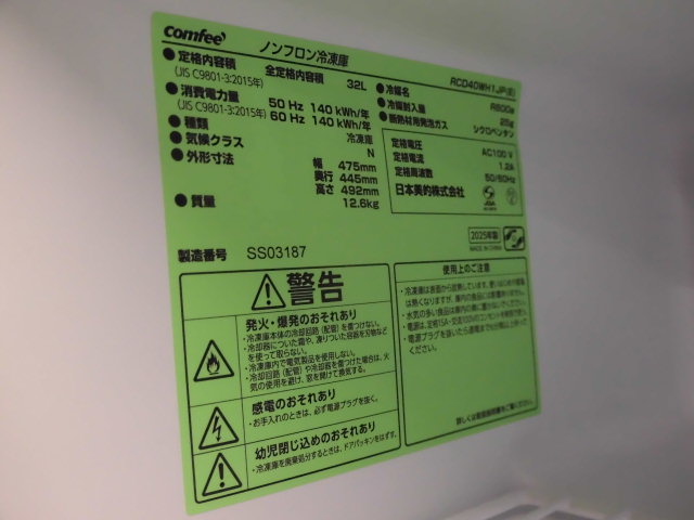 中古厨房 COMFEE' 1ドア 冷凍庫 RCD40WH1JP 100V 32L 右開き ホワイト 静音 温度調節7段階 コンパクト 家庭用 一人暮らし 2025年製