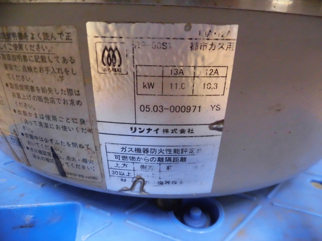 中古厨房 業務用 リンナイ ガス炊飯器 RR-50S1 都市ガス 5.5升 10L 卓上 圧電式 立消え安全装置付 W525×D480×H434mm 店舗 飲食店