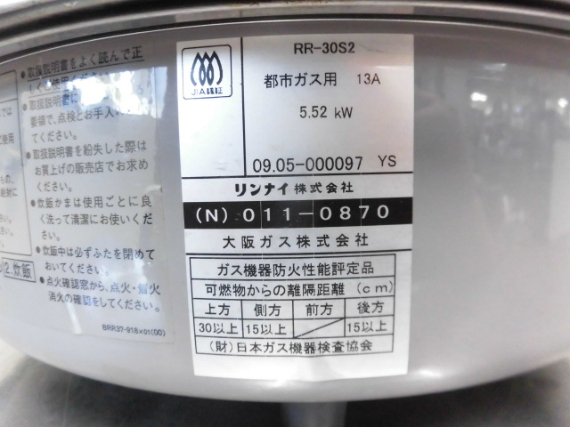 中古厨房 リンナイ 業務用 卓上 ガス炊飯器 RR-30S2 都市ガス 圧電点火 6L 3升3合炊き 立ち消え安全装置 W466×D438×H424mm 店舗 飲食店