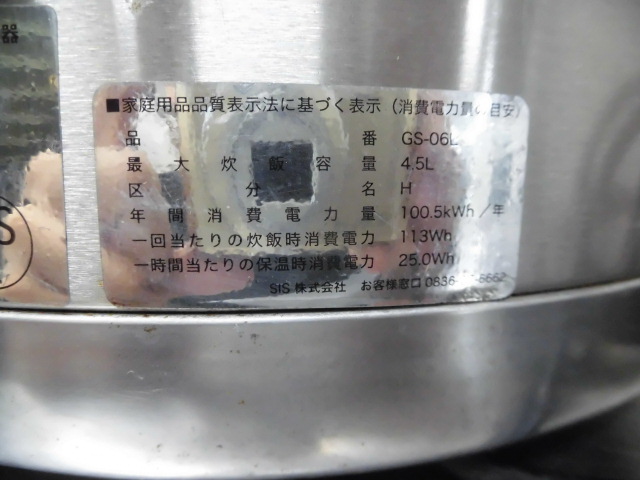 中古厨房 業務用 SIS エスアイエス 卓上 電気式 銀しゃり 炊飯器 GS-06L 100V 4.5L 2.5升 お茶碗約50杯分 ステンレス 炊飯&保温ランプ