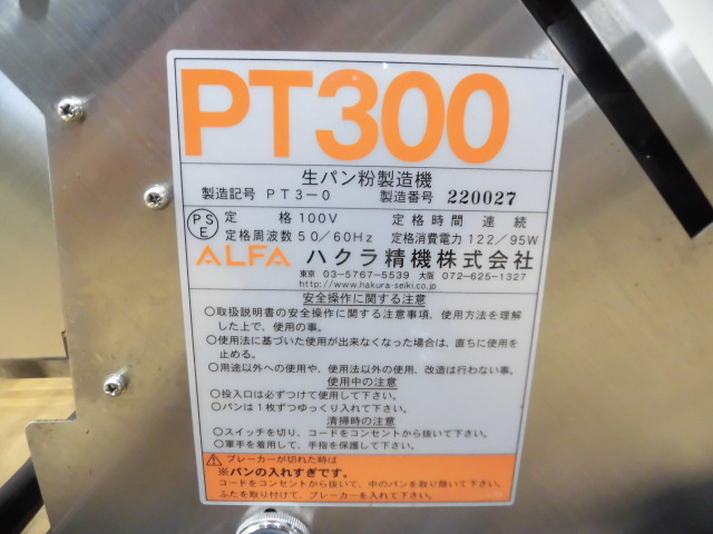 中古厨房 ハクラ精機 業務用 アルファ 生パン粉 製造機 PT300 アミ目6mm 100V W270×D515×H520mm 左手用押しボタンスイッチ 20kg/1時間