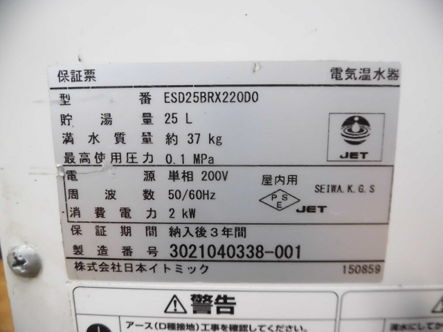 中古厨房 イトミック 業務用 角型 床置型 電気温水器 ESD25BRX220D0 単相 200V 貯湯量25L 60〜92℃ マイコン 省エネモード付 2020年製