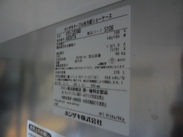 中古厨房 ホシザキ 業務用 台下 冷蔵ショーケース アンダーカウンタータイプ RTS-120SND 100V 270L 中瓶178本 大瓶161本 庫内灯 2022年製