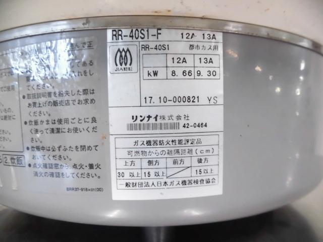 中古厨房 業務用 リンナイ 卓上型 ガス 炊飯器 RR-40S1-F 4.5升炊き 8.0L 都市ガス 圧電式 立消え安全装置 W540×D500×H420mm 2017年製