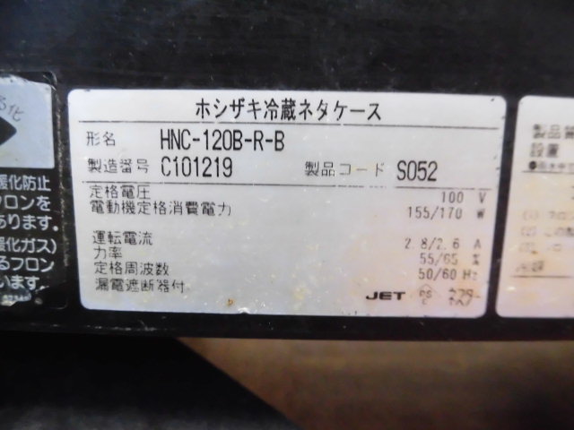 中古厨房 業務用 ホシザキ ネタケース 冷蔵ショーケース HNC-120B-R-B 100V 42L 100V 機械室右側 W1200×D345×H270mm 寿司屋 炉辺