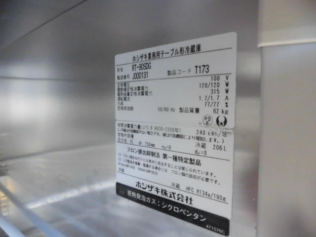 中古厨房 ホシザキ 業務用 1ドア 台下 冷蔵庫 コールドテーブル RT-90SDG 100V 206L 左機械室 左開き 庫内灯 W900 D750 H800mm 2019年製