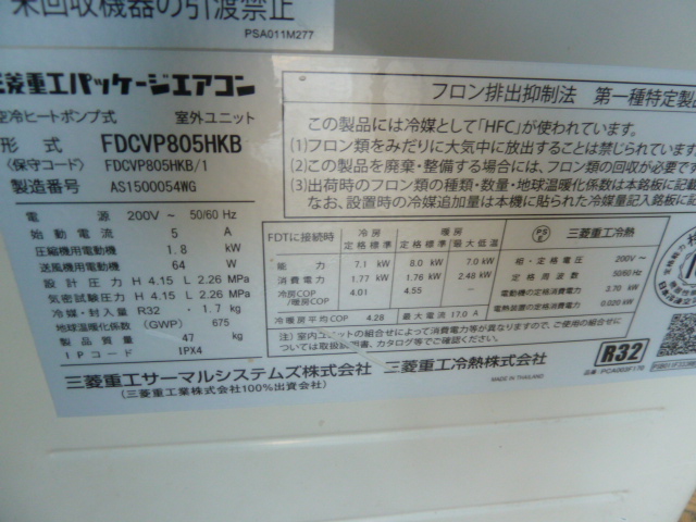 三菱重工 業務用 パッケージ エアコン 床置形 3馬力 シングル FDFV805HKB5SA 標準型 単相200V リモコン内蔵 ハイパーインバーター 2023年