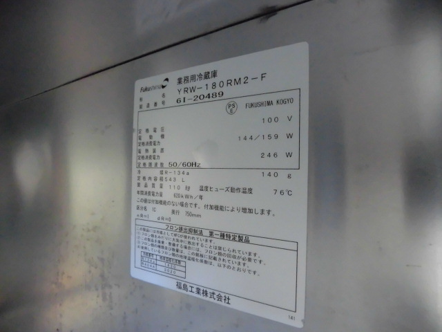 中古厨房 フクシマガリレイ 業務用 台下 冷蔵庫 コールドテーブル YRW-180RM2-F 100V 543L センターピラーレス 庫内灯 W1800 D750 H800mm