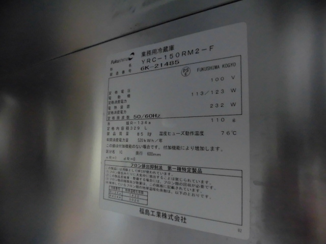 中古厨房 フクシマガリレイ 業務用 台下 冷蔵庫 コールドテーブル YRC-150RM2-F 100V 329L 庫内灯 センターピラーレス W1500 D600 H800mm