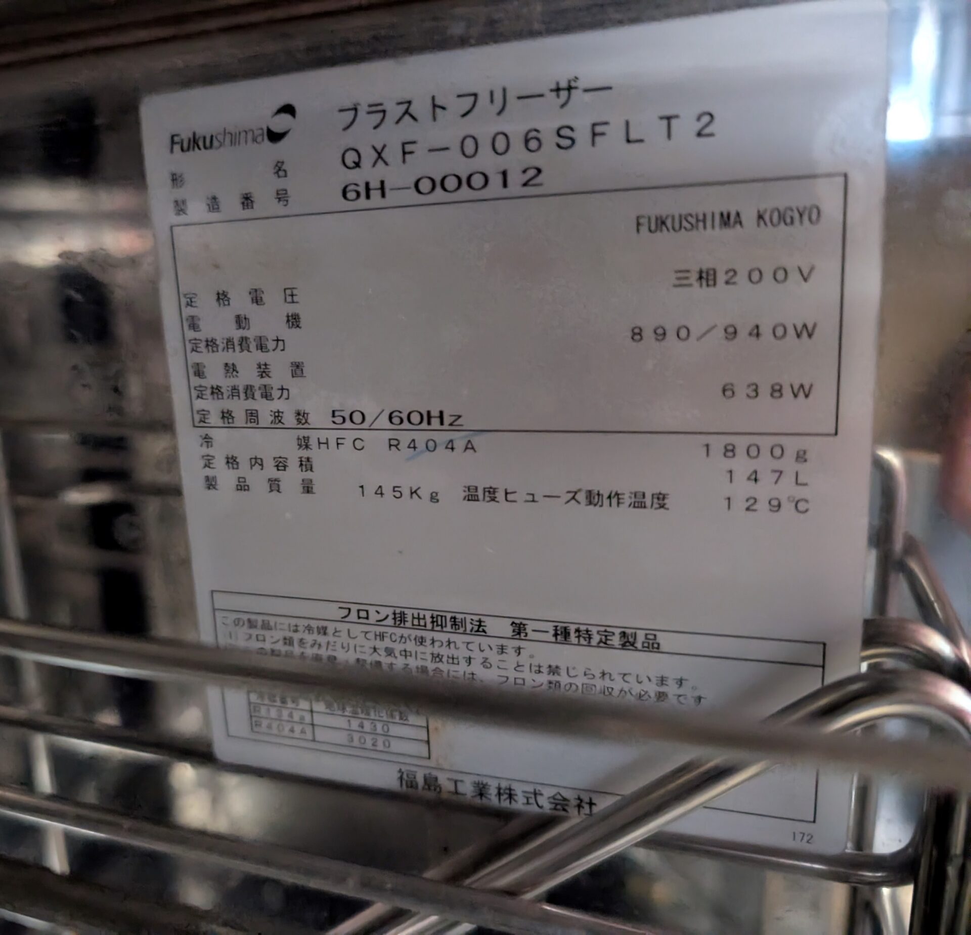 中古厨房 フクシマガリレイ 業務用 ブラストチラー ショックフリーザー6型 QXF-006SFLT2 三相 200V 147L -40℃ 芯温計 急速冷却凍結