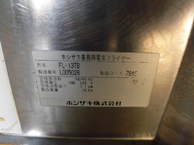 中古厨房 ホシザキ 業務用 1槽式 卓上 電気 フライヤー FL-13TB 油量13L 3相 200V 5.1kw ヒータースイングアップ式 ヒーターカバー 2021年