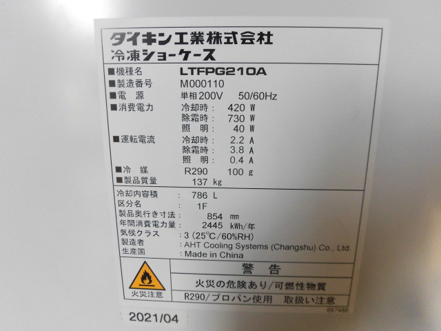 中古厨房 ダイキン 業務用 冷凍 ショーケース LTFPG210A 単相200V 786L 照明 ブラウン W2100 D860 H830mm 引取限定 配達可能地域有 2021年