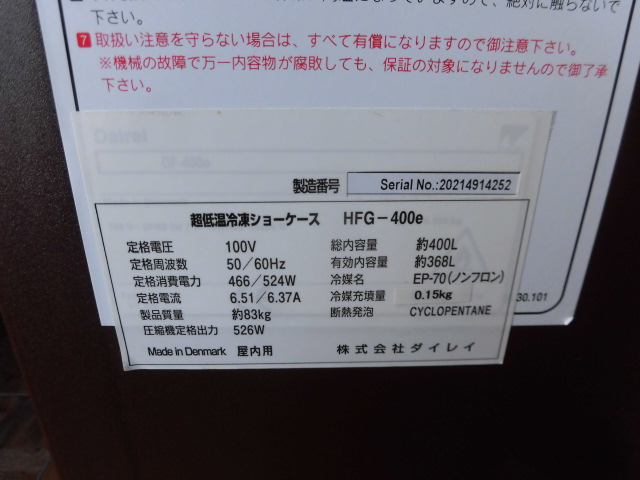 中古厨房 ダイレイ 業務用 スーパーフリーザー HFG-400e 100V 368L -45℃〜-63℃ 超低温 冷凍ストッカー 冷凍庫 まぐろ 海老 カニ 2021年