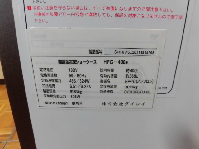 中古厨房 ダイレイ 業務用 スーパーフリーザー HFG-400e 100V 368L -45℃〜-63℃ 超低温 冷凍ストッカー 冷凍庫 まぐろ 海老 カニ 2021年